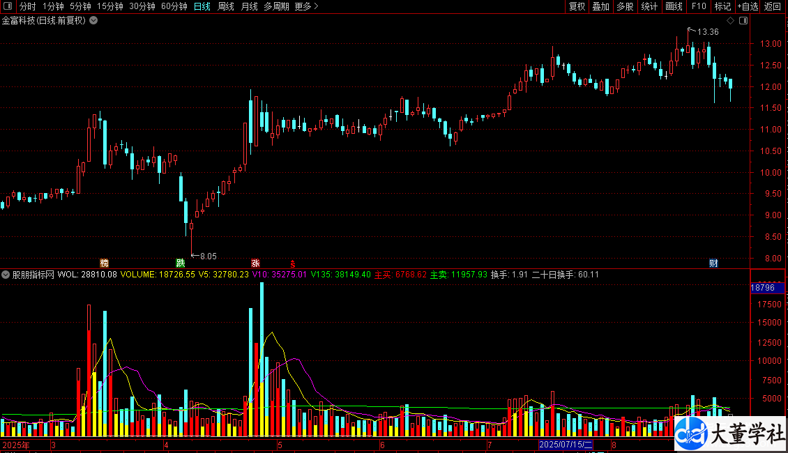 2. 成交量均线:绘制5日、10日和135日的成交量移动平均线(V5, V10, V135),用于观察成交量趋势。