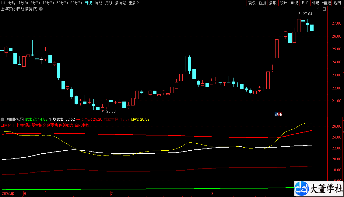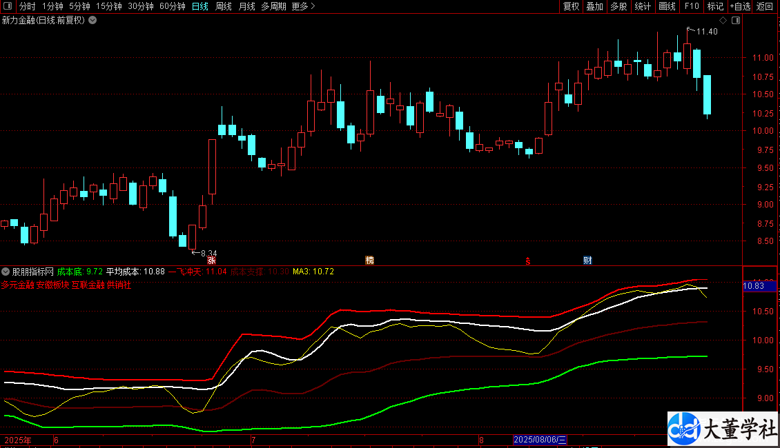 2. 成本线指标:基于筹码分布计算三条成本均线(成本底、平均成本、一飞冲天),并绘制一条成本支撑线(成本底与平均成本的均值)。另有一条黄色EMA线(MA3),用于辅助分析。