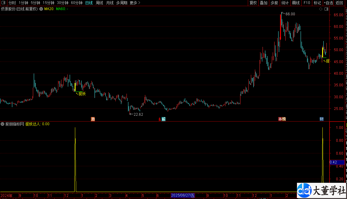 1. 主图:出现**黄色K线+捉妖文字提示**+绿色支撑线,为核心妖股介入信号,同步标注涨停K线,直观看清股价强势形态;