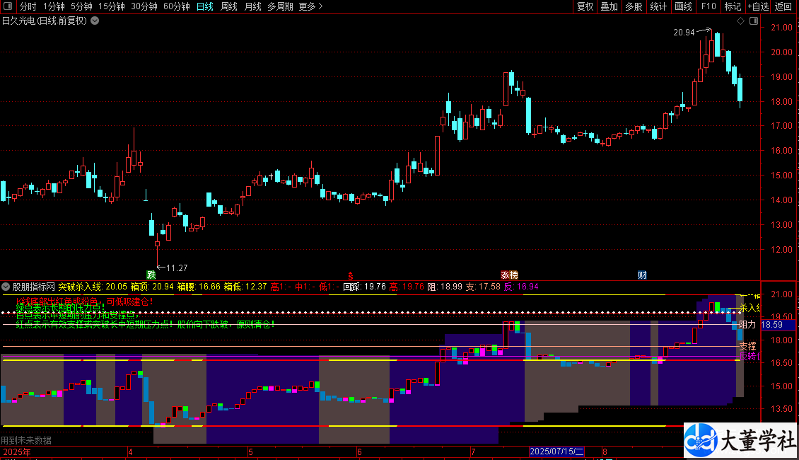 使用方法:将代码复制到公式编辑器,选择“副图”或“主图叠加”类型,应用于K线图即可显示。支撑线、进场线、移动止损线、轨道、ZIG图标和“暴涨”文字会自动生成,用于辅助判断买卖点。